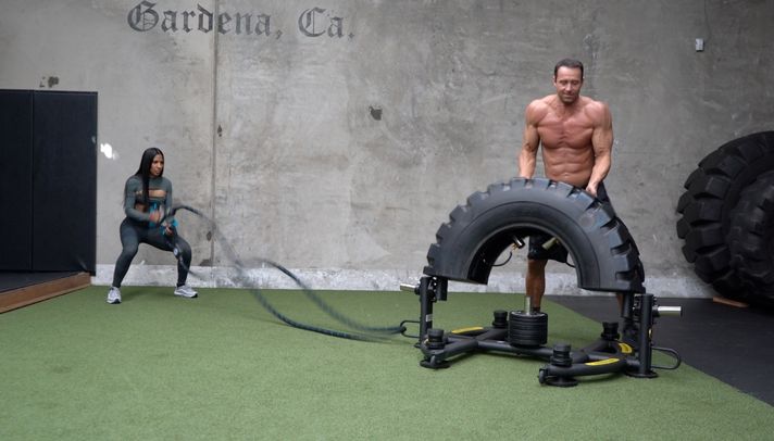 Grip the tire and drive upward using your legs and hips. Once upright, push it back down and repeat. Load Olympic plates for more resistance and use the included battle rope anchors for even more versatility.